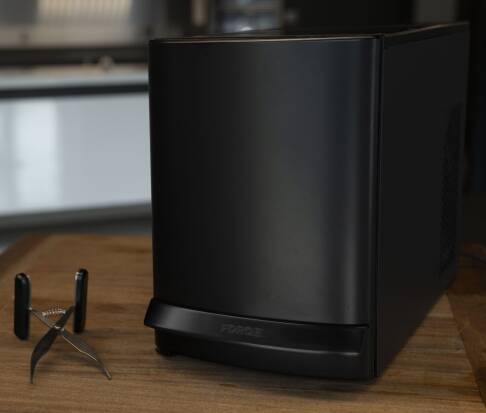 The Forge Clear Ice Maker produces a pair of large blocks of gem-shaped clear ice at a time, and stores up to 8 gems at the ideal temperature to be able to use immediately in the Forge Clear Ice Press.
