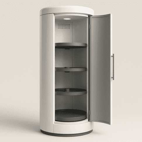 ● Food is always visible due to circular, rotating shelves ● Pocket door improves access in small spaces ● Consistent air circulation improves energy efficiency and preservation