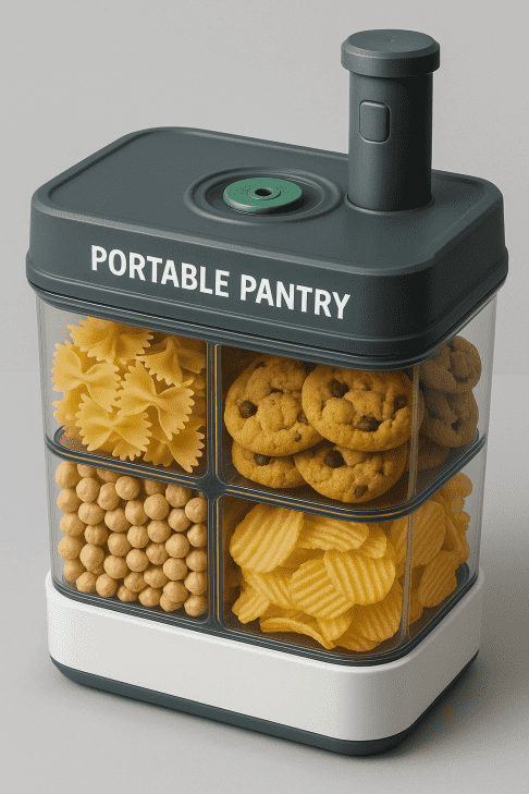 Fridge-like design, that does not need to cool, but suck the air out when doors are closed and keep the critters away. Multiple opportunities for design. But could have a bottom door that opens to shelves that you put open chips, cookies, flour, etc. into to store. The top door could open to a shelf that you could put a cake or pie to cool. Or when half eaten, put back as well.